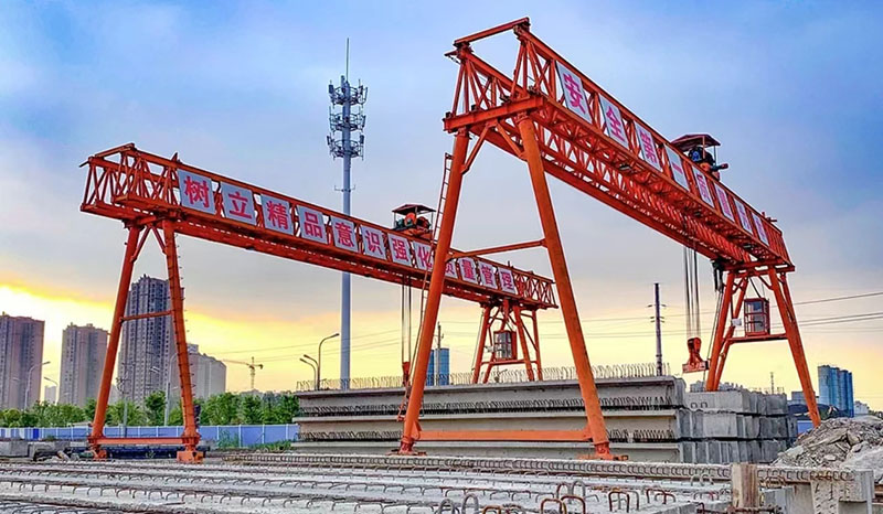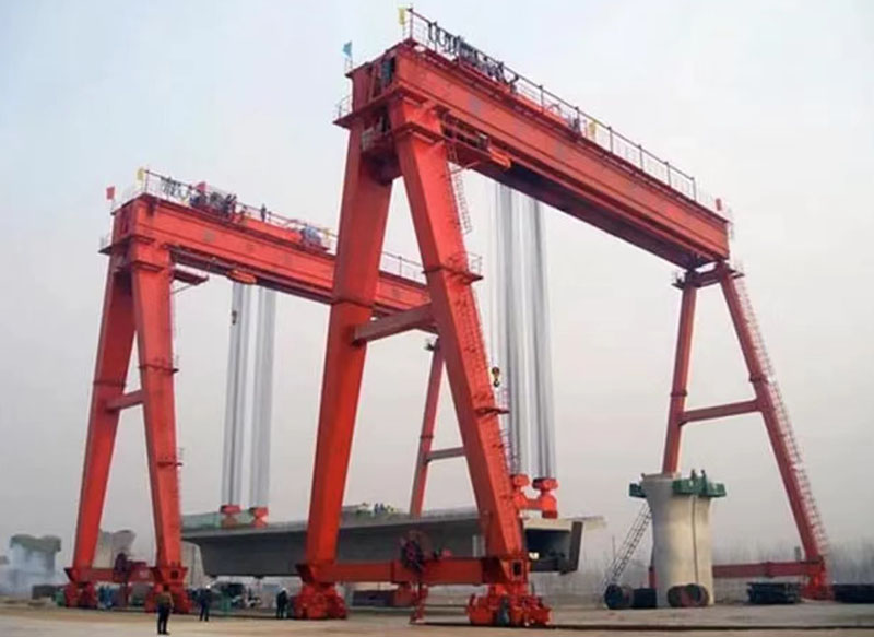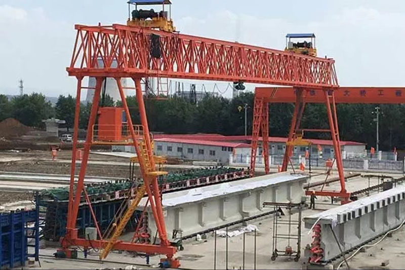 提梁機是一種為橋梁建設而專門設計的一種門式起重機。提梁機既可兩臺配合抬吊預制梁,也可以單臺起重機配雙吊具起吊預制梁,兩臺同時起重的提梁機各自的起重量一般為450噸,單臺起重的提梁機起重量通??蛇_900噸。它配置支腿行走、天車行走及天車起吊設備,可以實現全方位機械化動作。主要用于將預制梁從制梁臺提吊至存梁臺位,預制梁養(yǎng)護完成后將其從存梁臺位吊運到運梁車上。作為起重設備完成架橋機的組裝和拆卸。還用于架設墩身不高的旱橋。